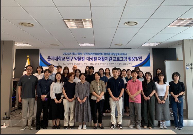 이번 세미나는 국내에 부재했던 표준화된 약물별·대상별 중독재활 매뉴얼을 실무에 적용하기 위한 첫 발걸음으로, 식품의약품안전처 용역 연구사업으로 을지대학교가 개발한 「약물별⋅대상자별 재활지원 프로그램」을 활용하여 현장 실무자들의 전문성을 체계적으로 강화하는데 목적을 두었다.