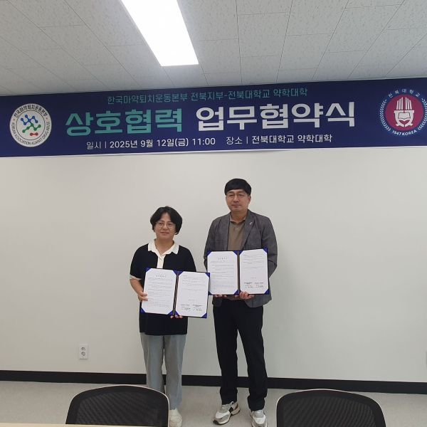 한국마약퇴치운동본부 전북지부(지부장 백경한)와 전북대학교 약학대학(학장 배은주)은 지난 12일 전북대학교 약학대학에서 상호협력 업무협약을 체결했다.